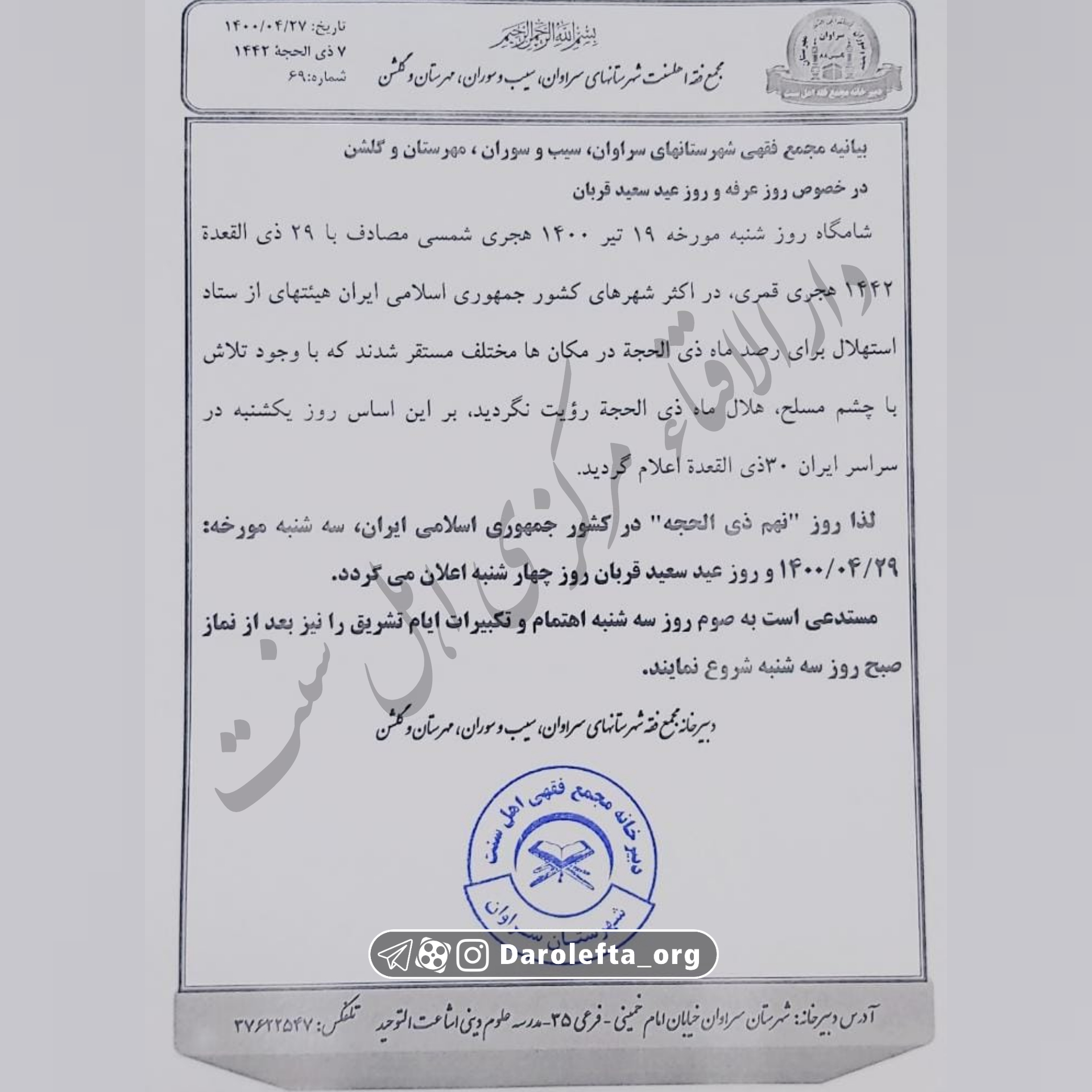 بیانیه مجمع فقهی شهرستانهای سراوان، سیب و سوران ، مهرستان و گلشن در خصوص روز عرفه و روز عید سعید قربان